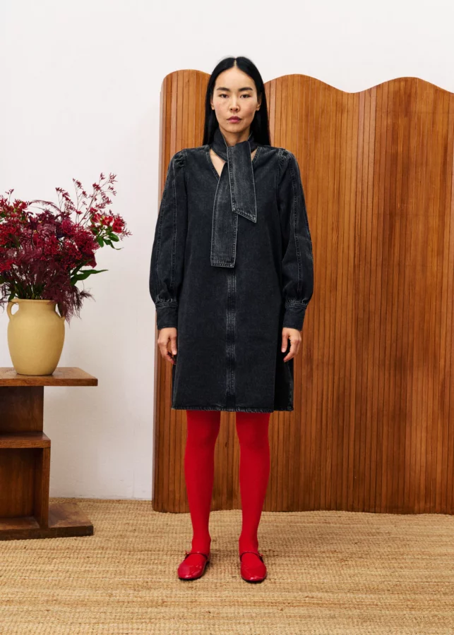 Short length dress in black denim, puffed sleeve and